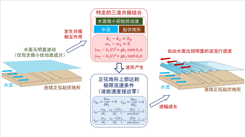 成人漫 河口海岸综合治理与保护研究团队与美国MIT研究人员合作,采用多重尺度展开的奇异摄动解析,推导出连续沙波地形上逆流行进波振幅的空间分布理论解(图1);设计并开展348组波流水槽试验,发现在相对水深0.5~1.0和弗罗德数0.20~0.34的范围内,亚临界水流经过连续沙波地形时会激发逆流行进波;总结出逆流行进波的波幅、波数与频率等波要素随水流与地形条件的变化规律与空间分布,表明波幅随流速增大呈现单峰分布并体现出明显共振特征(图2-左),在正弦地形上部波幅以指数形式增长(图2-右);理论解析与水槽试验观测相结合,阐明了逆流行进波的波形产生与成长机制是基于沙波和波相位逆流传播的两个波组成的三波共振组合与地形上部水流流速接近共振波的极限流速条件的联合作用(图3)。