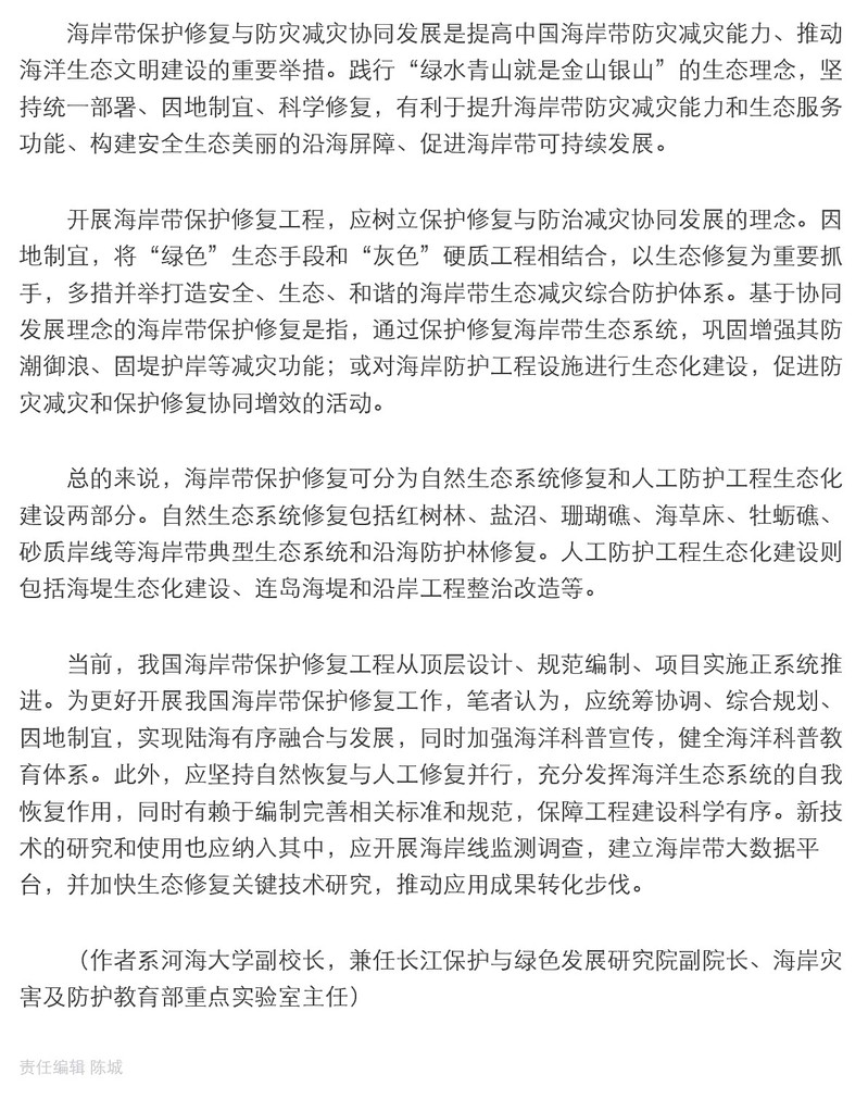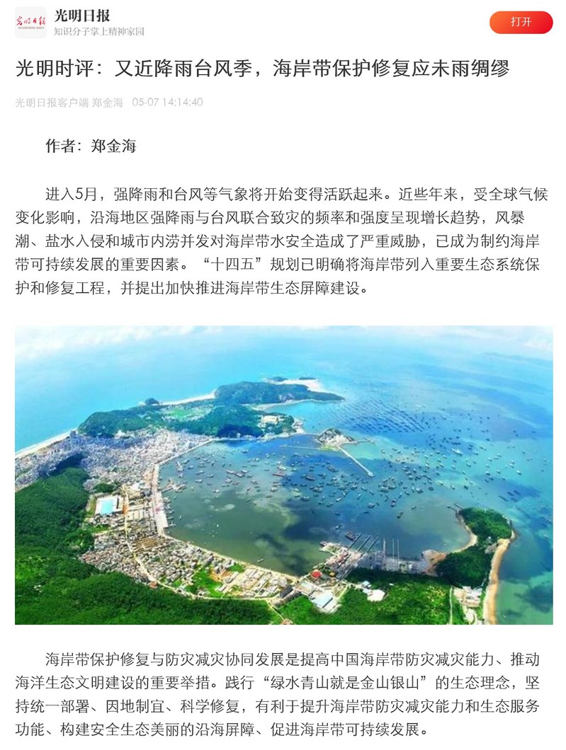 2021年05月07日,成人漫郑金海教授在《光明日报》的时评栏目,发表题为《光明时评:又近降雨台风季,海岸带保护修复应未雨绸缪》的署名文章。探讨了制约海岸带可持续发展的因素,并提出了我国海岸带保护修复与防灾减灾协同发展的工作建议。全文如下: