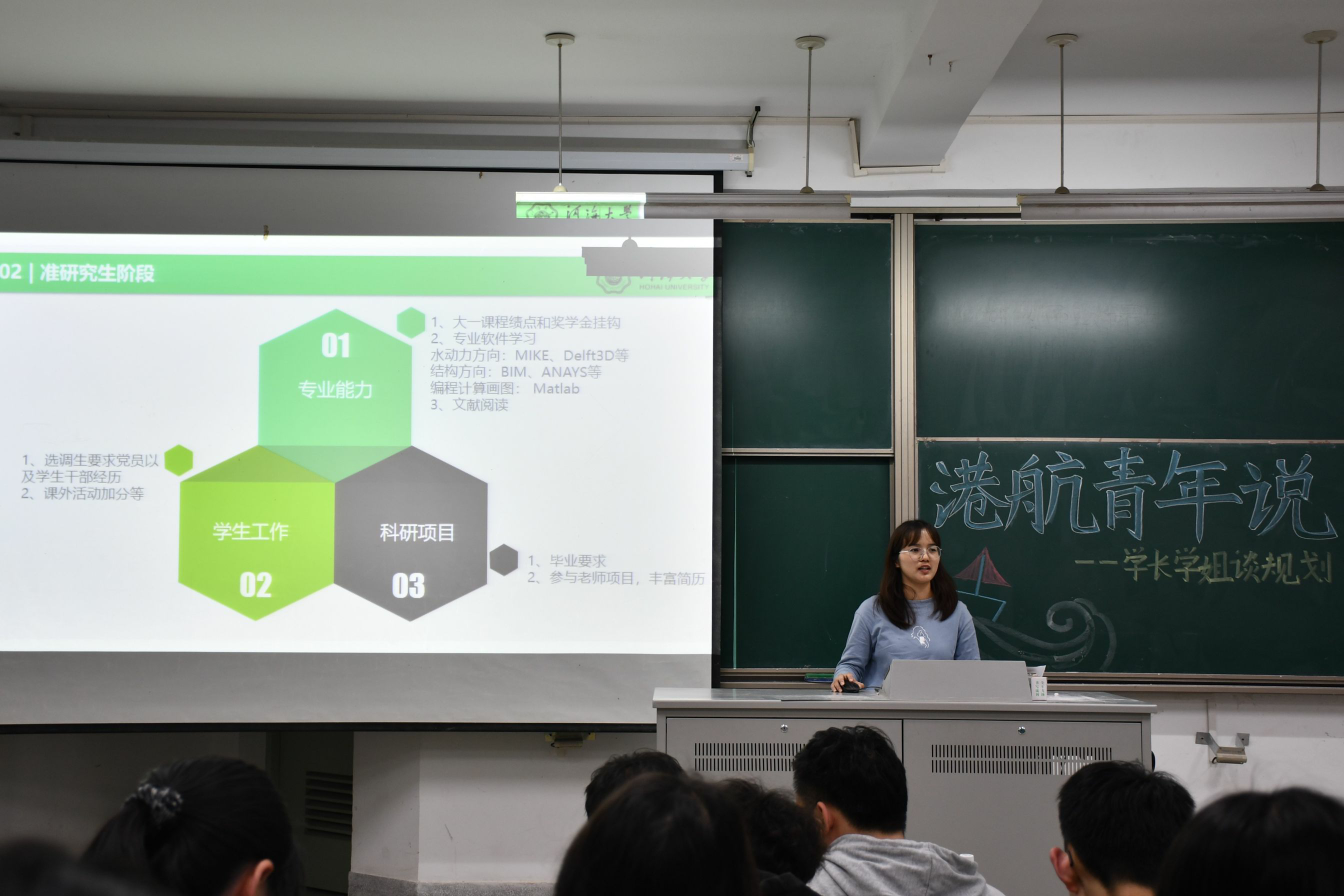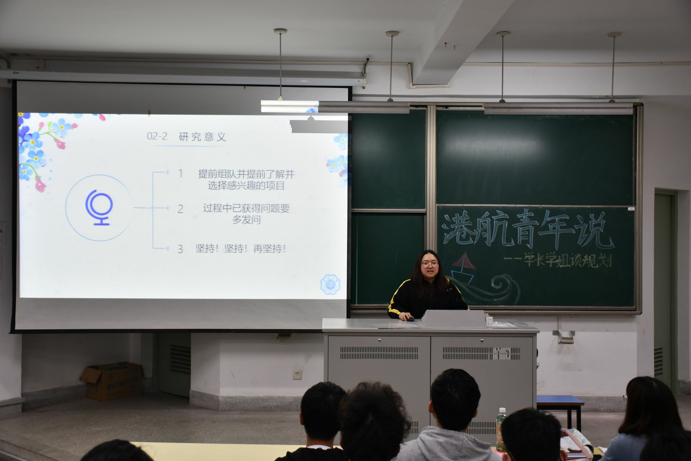 2021年5月6日,成人漫 “港航青年说”—学长学姐谈规划于江宁校区勤学楼5112举行。本次活动邀请了成人漫 研究生沈倩颖、丁星宇、王博文和本科生张颖男、张恩斗作为主讲嘉宾,向2019级学生分享大学生职业生涯规划经验。