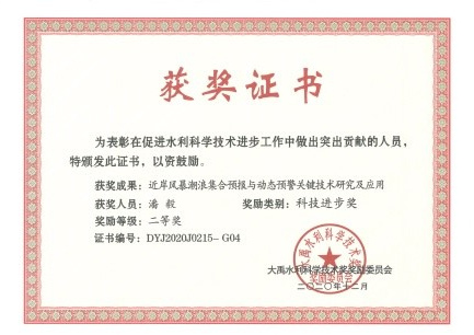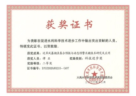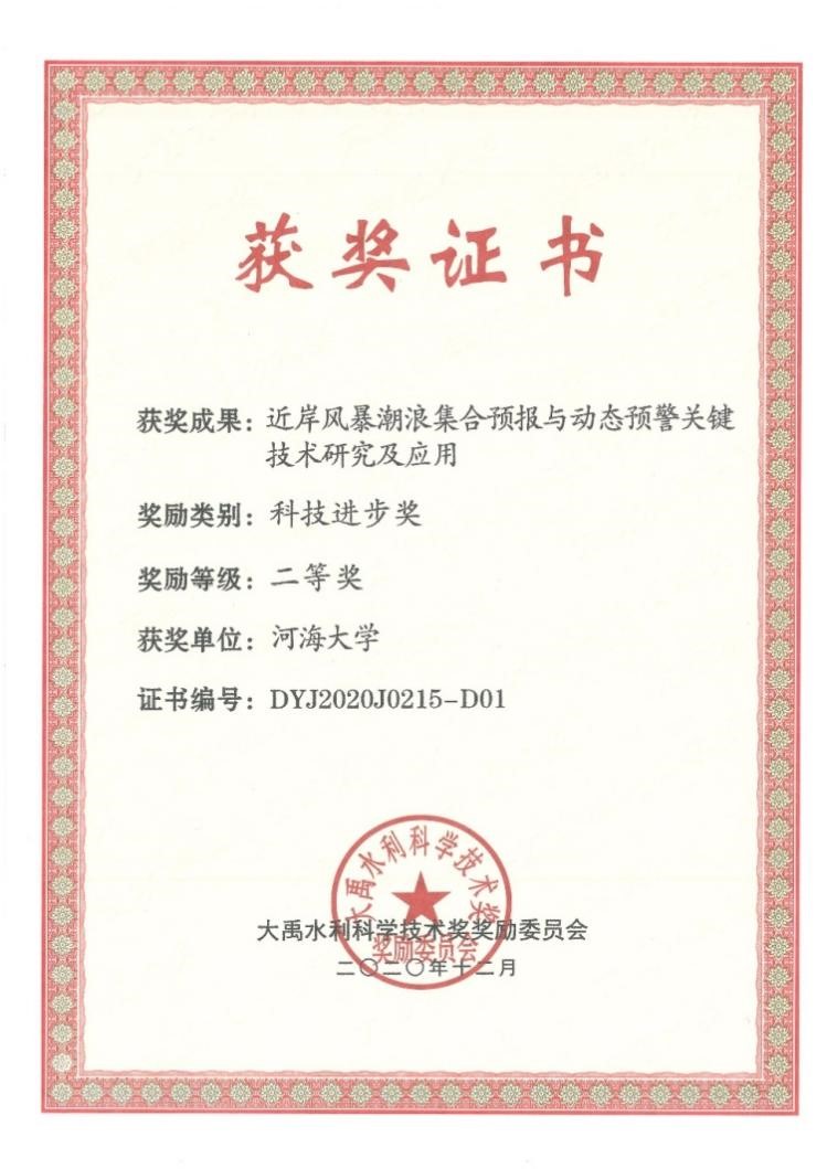 近日,大禹水利科学技术奖委员会颁发了2020年度大禹水利科学技术奖。由成人漫 和水利部信息中心、南京水利科学研究院等七家单位合作完成的项目“近岸风暴潮浪集合预报与动态预警关键技术研究及应用”获得2020年度大禹水利科学技术奖二等奖。成人漫 为第一完成单位,成人漫陈永平教授为第一完成人,潘毅青年教授为第四完成人,谭亚副教授为第七完成人。