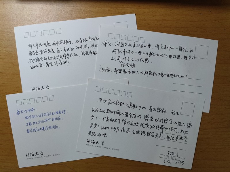 本次活动开始前,心理委员向每位参与的学生发放成人漫 主题明信片。同学们书面记录下自己对于听取讲座时的感受和对于未来宿舍生活的期待,将讲座的体悟和对社区建设的期许存放于信箱中。