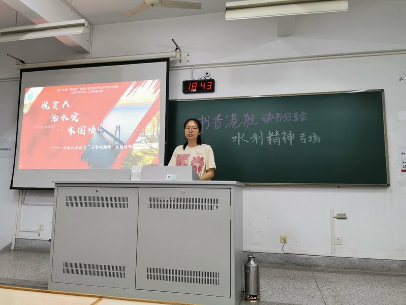 活动引导学生提前查阅历史文献,考察水利建筑发展史,发掘红色资源,赓续红色基因,增强学生作为水利人的使命担当。20级港航2班的刘欣雨带领大家了解王家坝的建设历史和运转情况,探寻“王家坝”精神的指导意义,学习党中央心系社稷福祉的为民情怀。港航5班的刘松旺通过列举水利先辈奋斗事迹,展现了水利人的高尚品德,向大家全面地介绍了水利精神内涵。