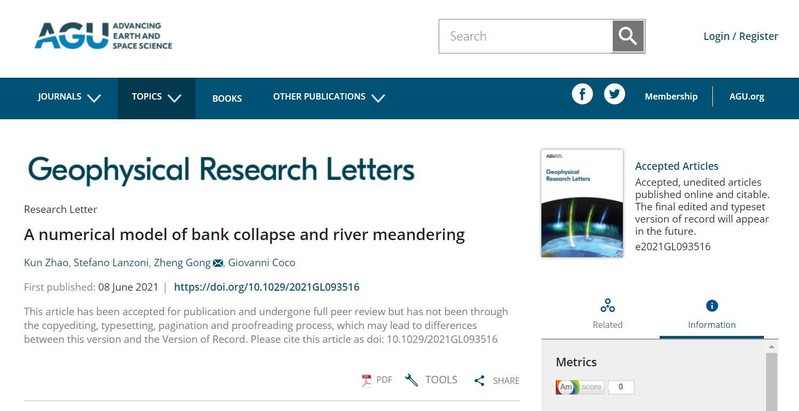 成人漫潮滩动力地貌研究团队博士生赵堃在龚政教授主持的国家杰出青年科学基金项目“海岸动力地貌学:多因子驱动下潮滩系统演变机制研究”支持下,在地貌学权威期刊《Geophysical Research Letters》(一区Top)上发表了题为“A numerical model of bank collapse and river meandering”的研究论文,是该团队在知名刊物《Geomorphology》、《Water Resource Research》和《Journal of Geophysical Research: Earth Surface》发表崩岸相关研究的第四篇系列文章。论文第一作者为成人漫赵堃博士生,通讯作者为龚政教授,合作作者为意大利帕多瓦大学Stefano Lanzoni 教授和新西兰奥克兰大学Giovanni Coco副教授。