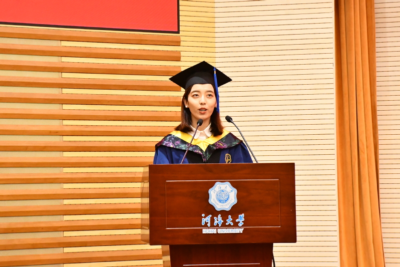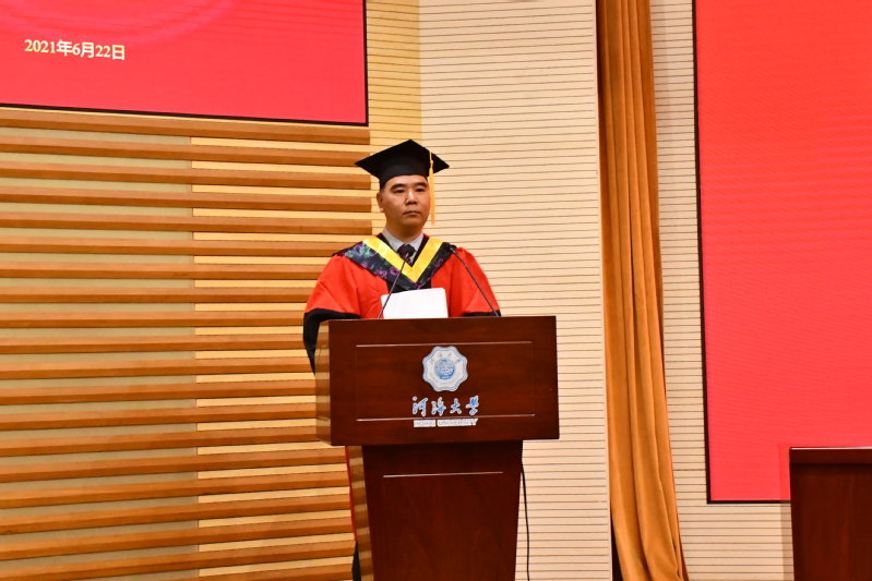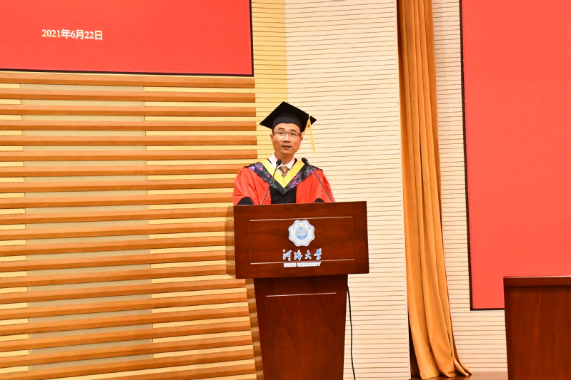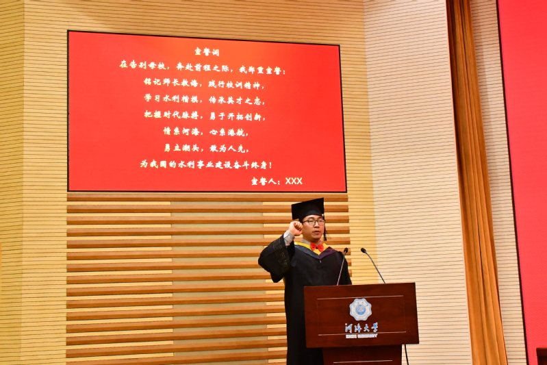 毕业生代表2018级硕士生冯辉同学通过回顾在河海经历的点滴成长与收获,表达了2021届全体毕业生对母校的依依惜别之情和对老师的崇高敬意,并表示新时代是奋斗者的时代,是青年的时代,生逢伟大时代,需全体毕业生以河海校训共勉,以实干担当为荣,成就更加开阔的人生。