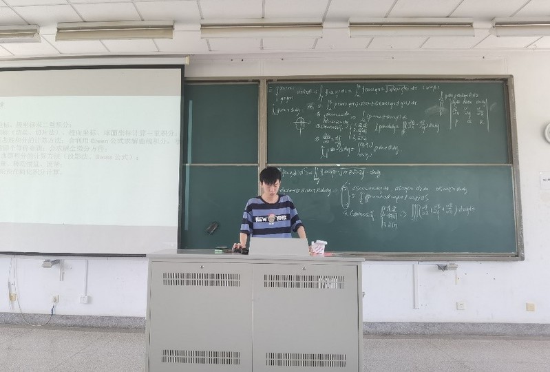 刘佳昊同学从多元函数微分学和级数两部分进行串讲。重点讲述了多元函数微分学中的曲线、曲面积分,及级数的判别方法,就知识点进行了详细的板书、罗列了所有的公式,并补充了相关计算的技巧方法。最后提出了考前策略与建议,对易失分点进行总结,并祝愿大家都取得好成绩。