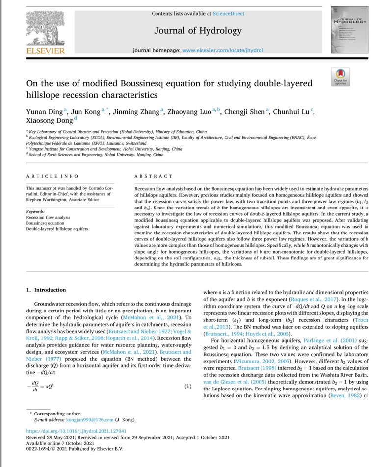近日,成人漫孔俊教授指导的2019级硕士研究生丁宇楠在《Journal of Hydrology》上发表了题为“On the use of modified Boussinesq equation for studying double-layered Hillslope Recession Characteristics”的学术论文。该研究是继孔俊教授2016年提出的Kong-HSB理论的又一重要突破。