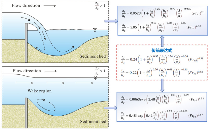 2022年1月,美国土木工程师协会公布了2022年度J. C. Stevens Award。成人漫 河口海岸综合治理与保护研究团队骨干成员管大为教授与四川大学合作的讨论文章“Discussion of ‘New Approach to Predicting Local Scour Downstream of Grade-Control Structure,’ in the Journal of Hydraulic Engineering, June 2021.”获得殊荣。这个奖项为了纪念美国土木工程师协会杰出工程师、前主席John C. Stevens先生于1943年设立的,每年评选一次,由美国土木工程师协会环境与水资源分会主办的Journal of Hydraulic Engineering、Journal of Hydrologic Engineering、Journal of Environmental Engineering等7种期刊的全体编委从前一年度发表的讨论论文中提名、遴选,授予一篇最具突出学术贡献的文章。这是该奖设立近80年来第一次授予河流与海岸动力学领域的中国学者,先前获奖的研究人员包括国际著名泥沙研究学者Hans Albert Einstein、IAHR前主席John F. Kennedy、美国科学院院士Gary Parker等。已有研究表明,固床工的水毁率高达70%,损毁还会使上下游地形发生剧烈冲刷下切,产生严重后果。由于固床工的冲刷破坏通常发生在强动力、强输沙的洪水过程中,冲刷机理非常复杂,冲刷深度预测十分困难。论文提出在固床工冲刷分析模型中考虑水流淹没度的影响,基于“自由出流”和“淹没出流”条件下的冲刷特征,重构了固床工冲刷的理论模型,建立适用于不同淹没条件的冲刷深度预测新方法(图3)。新的理论模型更能准确反映复杂水动力条件下固床工的冲刷机制,提出的冲刷深度预测方法与传统方法相比,平均误差减少58%。