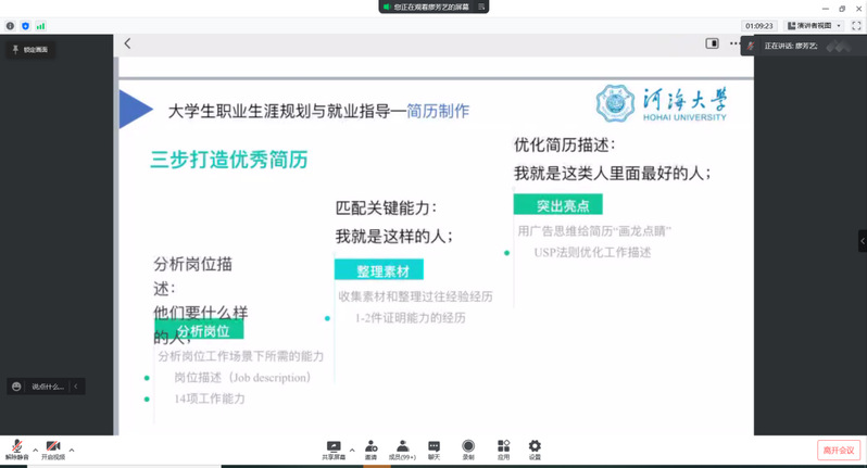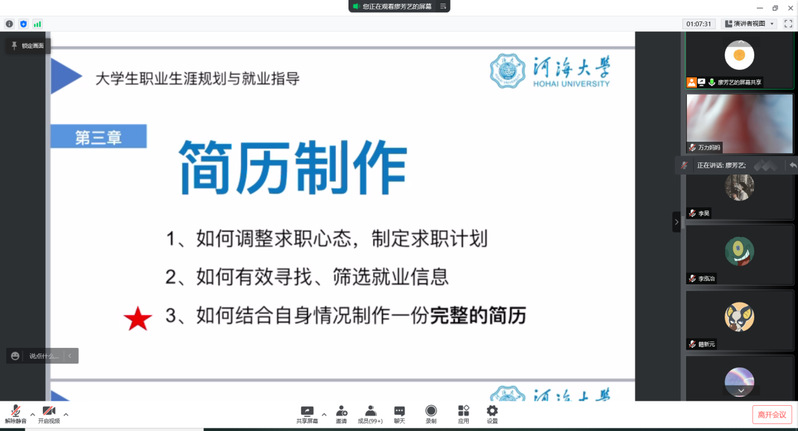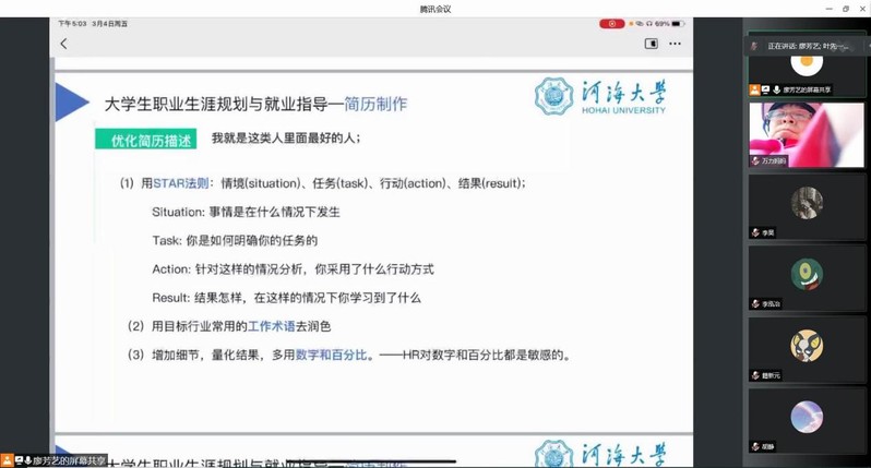 2022年3月4日下午,成人漫 2019级在线上开展职业生涯规划和简历制作培训会。大会由2019级本科生辅导员廖芳艺主持,2019级全体学生及家长参加本次大会。廖芳艺老师就年级整体学习情况、大三学年生涯规划、简历制作培训进行分享。