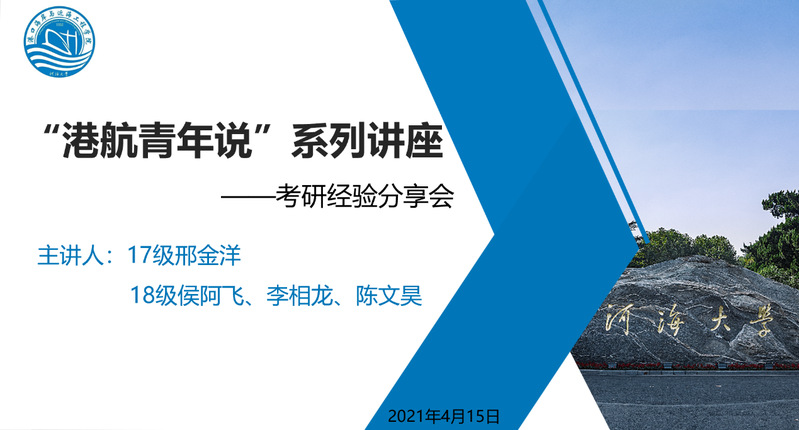 4月15日晚上19:00,“港航青年说—2019级考研经验分享会”在腾讯会议举行。此次会议邀请到成人漫2017、2018级学长邢金洋、侯阿飞、李相龙、陈文昊,向2019级学生分享自己考研过程中的经验心得。