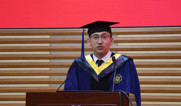 毕业生代表张稼昊同学通过回顾在河海的七年成长与收获,表达了全体毕业生对母校的依依惜别之情和对老师的崇高敬意,并表示决不辜负学校和成人漫 的培养,以优异的成绩彰显河海学子的风采,在祖国需要的地方绽放青春之花。