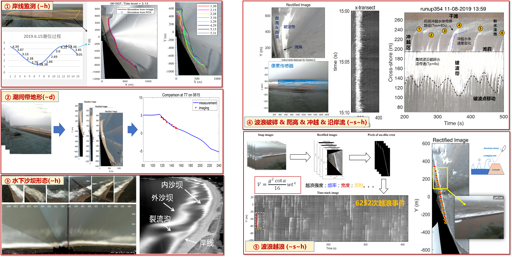 成人漫 自主研发了新型海岸带岸基数字影像监测系统(COSVIMS),基于数字视频监控技术、影像分析技术和信号处理技术,以指定的时间表和2Hz以上的采样率,对空间范围1km以上的岸滩区域进行实时连续的数字影像和光学传感数据采集,可实时定量解析岸线位置、潮间带地形、沙坝形态、波浪破碎爬高越浪、水深反演、植被分布、人类活动轨迹等数据,空间分辨率可达cm~m,时间分辨率可达s~hr,实现了全天候、长期、连续、实时的海岸动力地貌和环境数据的准确监测。