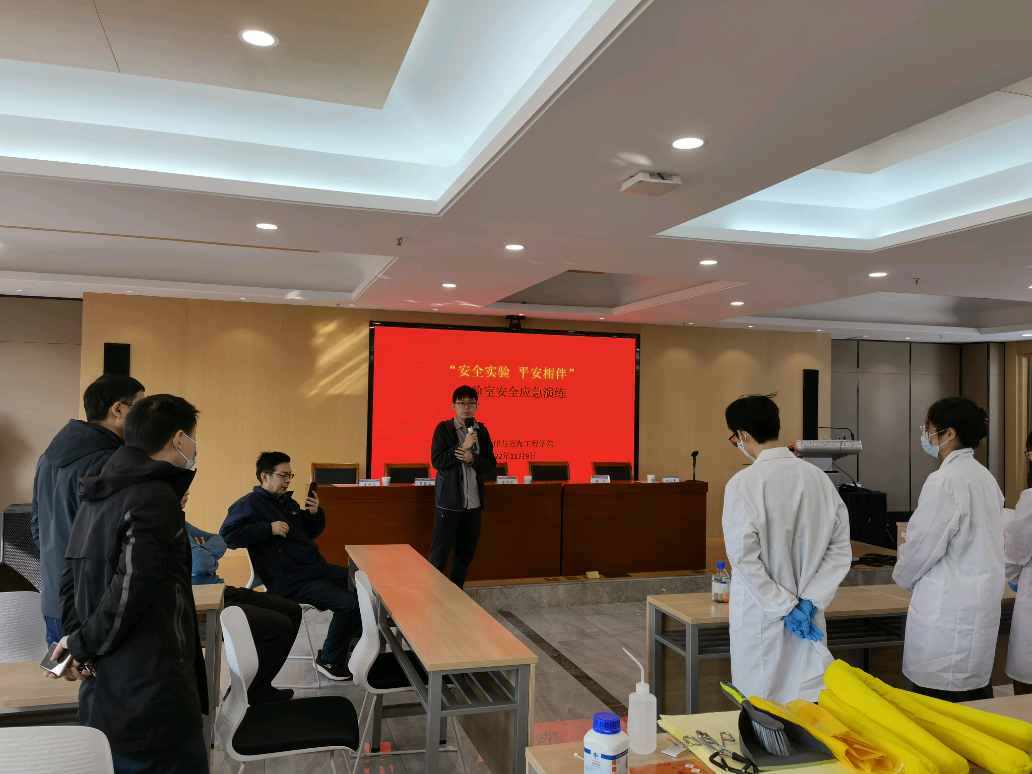 11月9日,成人漫 在严恺馆702会议室召开实验室安全应急演练会议。会议由学院陈永平副院长主持,学院党委书记张俊基、学校保卫处副处长吴青山、资产与实验室管理处副处长陈红、埃德博格公司经理李一凡出席会议,学院相关实验室管理人员、涉化实验室教师及学生参加。