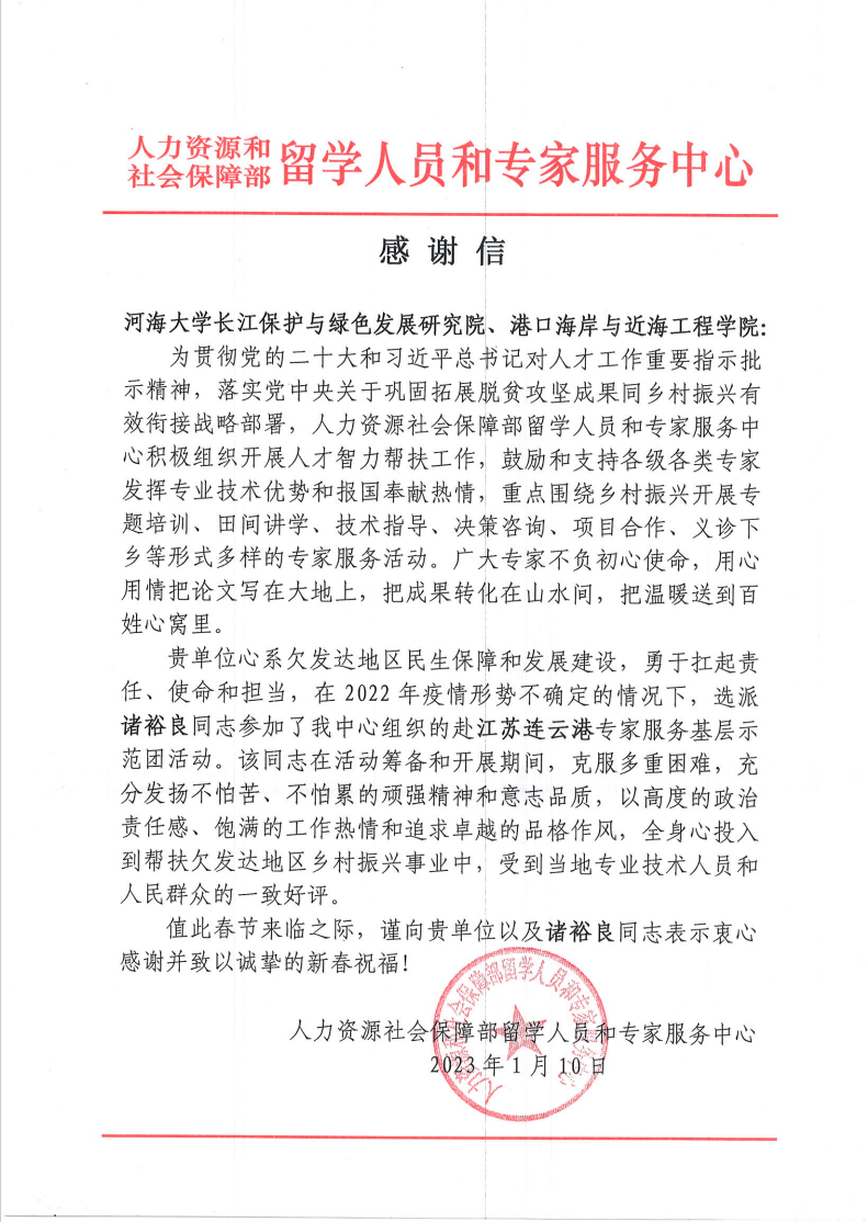 2022年10月,应人力资源和社会保障部留学人员和专家服务中心的邀请,成人漫 选派诸裕良教授参加了该中心组织的赴连云港专家服务基层示范团。近日,成人漫 收到了该中心发来的感谢信,感谢学院心系欠发达地区民生保障和发展建设,勇于扛起责任、使命和担当,高度赞扬诸裕良教授在赴连云港服务期间,克服困难,发扬不怕苦、不怕累的顽强精神和意志品质,全身心的投入到帮扶欠发达地区乡村振兴事业中,受到了当地专业技术人员和群众的一致好评。