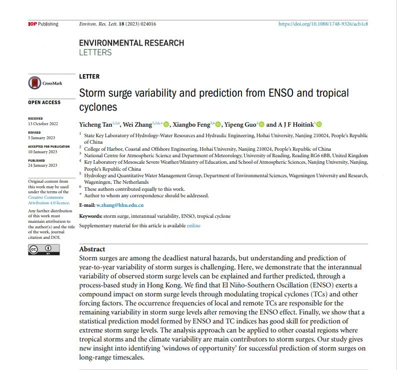 近日,成人漫 张蔚教授和英国雷丁大学冯向波研究员以及荷兰瓦格宁根大学Hoitink教授联合指导的2020级博士研究生谭易成在国际权威学术期刊ERL(Environmental Research Letters)(JCR一区,影响因子6.94)上发表了题为“Storm surge variability and prediction from ENSO and tropical cyclones”的学术论文。该研究成果得到了国家重点研发计划“粤港澳大湾区衍生复合灾害评估与应急避险关键技术”的资助,是张蔚教授研究团队近3年来在河口海岸防洪减灾方向发表的又一重要学术进展,为后续展开海陆交互“多碰头”情况下复合洪水灾害研究提供了基础。