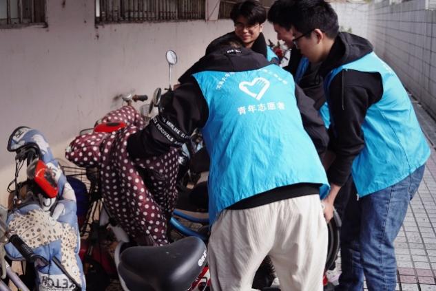 接着志愿者们又开始对严恺馆楼下两侧的非机动车道里停靠的自行车、电动车进行整理,他们挪动停靠不规范的车辆,将它们依次摆放整齐。了解到同学们规范停车意识较为淡薄,志愿者们还对前来停放车辆的同学进行引导,普及规范停车的重要性,增强大家规范停车、共建文明校园的意识与责任感。