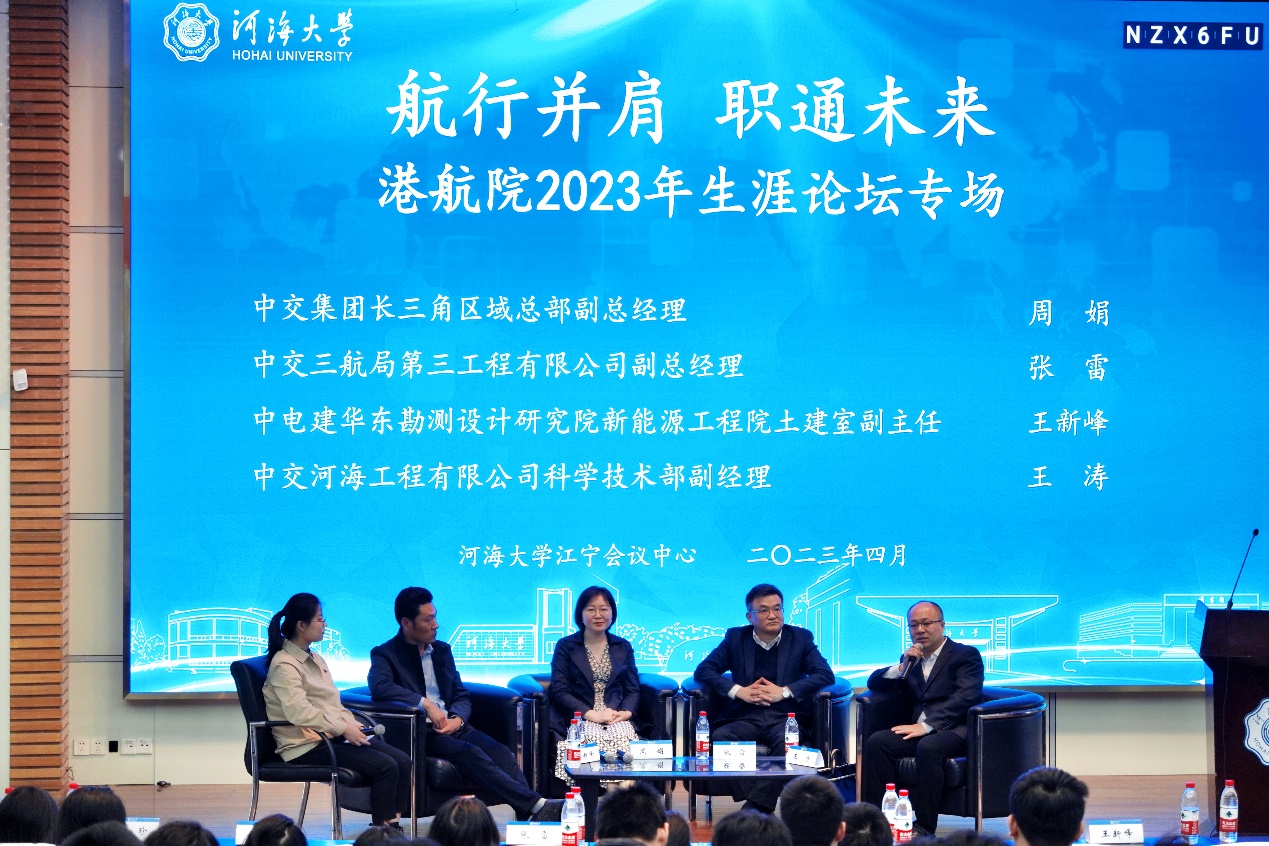 活动邀请到中交集团长三角区域总部副总经理、2005届校友周娟,中交三航局第三航务工程有限公司副总经理、1989届校友张雷,中电建华东勘测设计研究院新能源工程院土建室副主任、2011届校友王新峰,中交河海工程有限公司科学技术部副经理王涛,中交三航局第三工程有限公司人力资源部主管、副经理王珍。