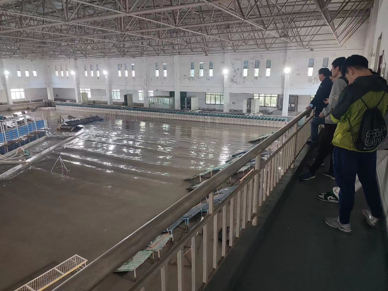 在泥砂基本理论试验实验厅,老师介绍了水槽的基本情况,讲解了泥沙输移方面的研究。老师围绕当前正在进行的浮式机场挡浪墙的试验,介绍了水槽模型布置,利用模型表面布置的波长传感器,为同学们现场演示了波浪作用在结构物表面的情况。