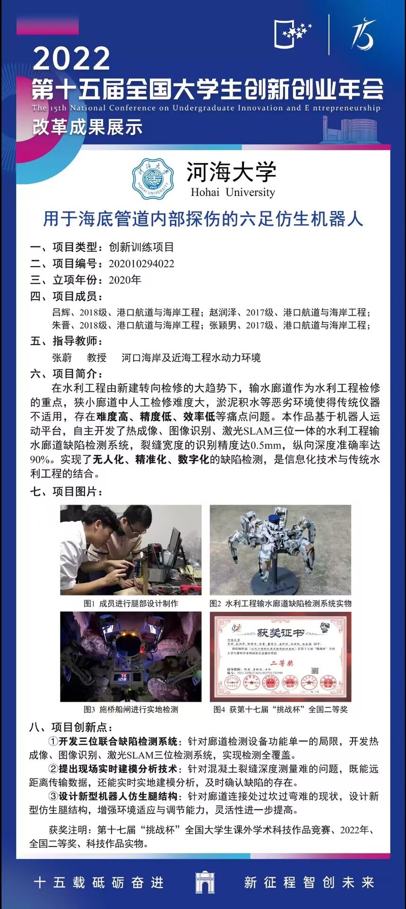 成人漫 吕辉、赵润泽、朱晋、张颖男等学生主要参与的国家级创新训练项目《用于海底管道内部探伤的六足仿生机器人》入选第十五届全国大学生创新创业年会改革成果展;同时,成人漫 创业项目成果南京神禹浚泰工程检测有限公司入选“国创计划”十五周年创业成果展。