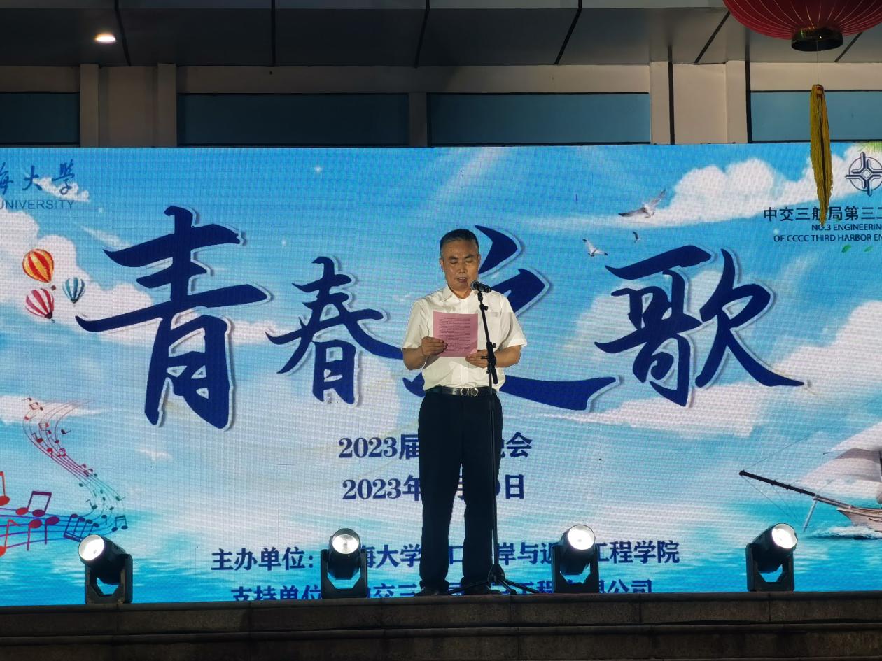 6月20日,成人漫 在严恺馆楼下举办“青春之歌”2023届毕业晚会。学院党委书记张俊基,中交三航局第三工程有限公司副总经理张雷,中交投资智慧新城项目公司总经理范公俊,副院长张继生、张蔚、陈永平,党委副书记沈国军,班导师、辅导员、家长代表及全体毕业生参加活动。