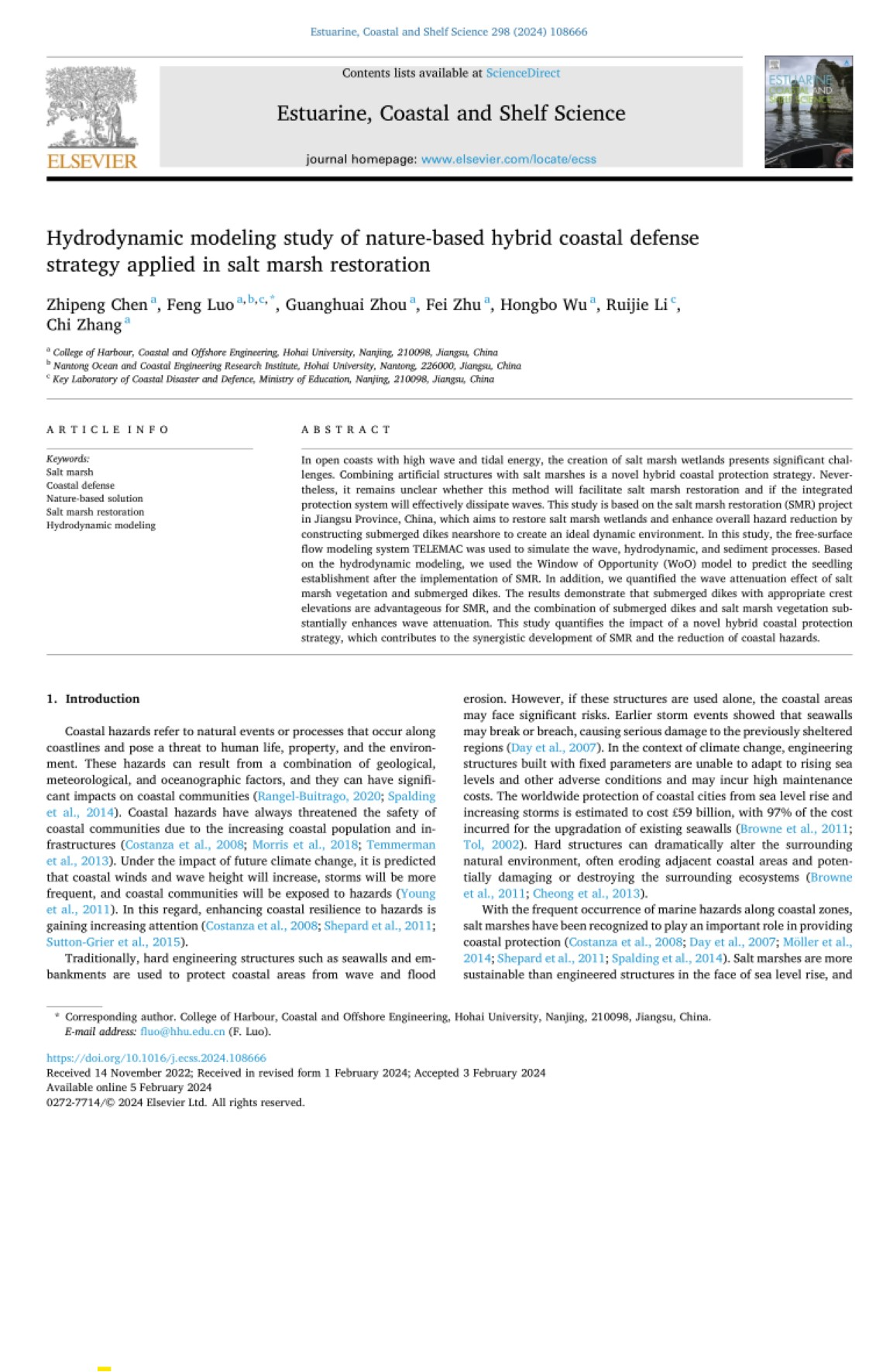 Chen Z, Luo F*, Zhou G, Zhu F, Wu H, Li R, Zhang C. Hydrodynamic modeling study of nature-based hybrid coastal defense strategy applied in salt marsh restoration[J]. Estuarine, Coastal and Shelf Science, 2024, 298: 108666. doi: