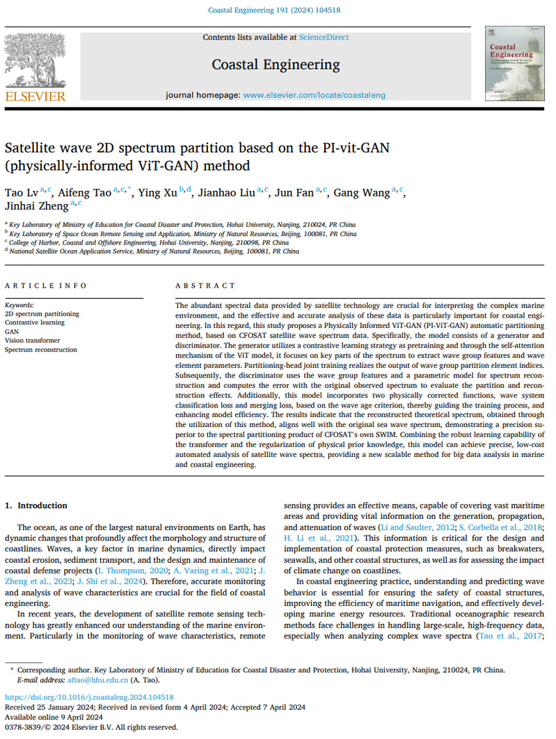 Tao Lv, Aifeng Tao*, Ying Xu, Jianhao Liu, Jun Fan, Gang Wang, Jinhai Zheng, Satellite wave 2D spectrum partition based on the PI-vit-GAN(physically-informed ViT-GAN) method, Coastal Engineering, Volume 191, 2024, 104518, ISSN 0378-3839, .