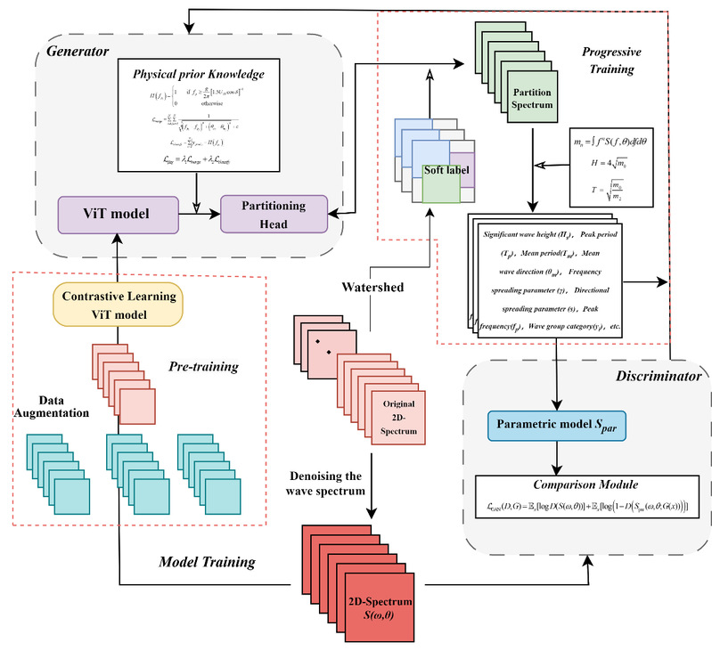 研究团队提出了一种新的波谱自动分区方法——物理信息的Vision Transformer生成对抗网络(PI-ViT-GAN),利用CFOSAT卫星波谱数据。首先通过实施卫星谱数据增强(图1)的对比预训练使模型初步获得捕捉谱特征能力和一定的抗噪声能力(图2)。之后该模型通过视觉转换器(ViT)的自我注意机制,专注于波谱的关键部分,提取波组特征和波元参数。分区头的联合训练实现了波组分区元素指数的输出,而判别器则使用波组特征和参数模型重建波谱,计算与原始观测波谱的误差,以评估分区和重建效果(图4)。此外,该模型整合了两种物理校正功能:波系统分类损失和合并损失,这两种损失都基于波龄标准,指导训练过程并提高模型效率。研究结果表明,通过这种方法重建的理论波谱与原始海浪谱非常吻合(图5),精确度优于CFOSAT自身的SWIM光谱分区产品(图3)。这项工作不仅展示了深度学习技术在海洋和海岸工程领域的应用潜力,还为大数据分析提供了一种新的、可扩展的方法。这种方法能够帮助科研人员更好地理解和预测海洋环境中的复杂物理过程,从而为海岸防护措施的设计和实施提供科学依据。