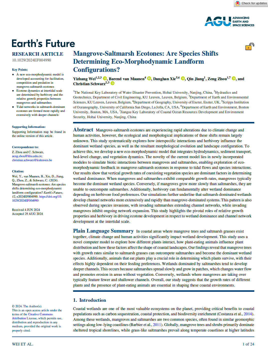 近日,Earth's Future期刊刊发了来自成人漫 的最新研究成果“Mangrove-saltmarsh Ecotones: Are Species Shifts Determining Eco-morphodynamic Landform Configurations?”(红树林-盐沼生态交错区:物种演变是否改变生态动力地貌格局),该成果的第一作者为成人漫蒋勤教授和周曾教授联合指导的博士生韦以璋,论文其他合作者包括比利时鲁汶大学Christian Schwarz助理教授、英国埃克塞特大学Barend van Maanen副教授和美国加利福尼亚大学谢当汉博士后。