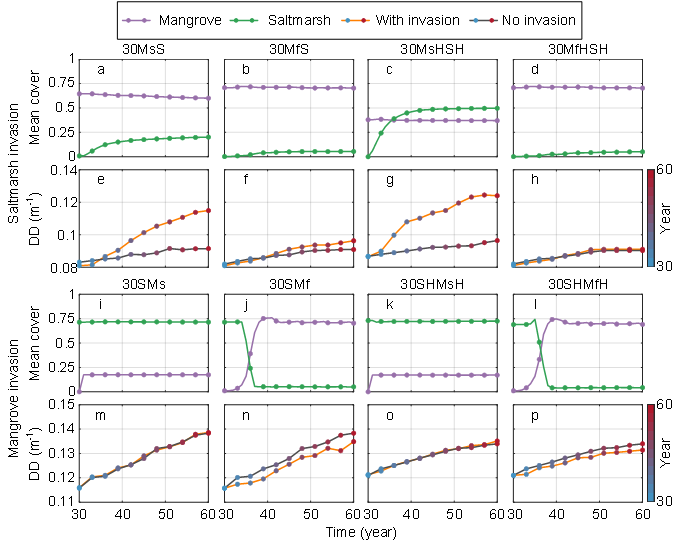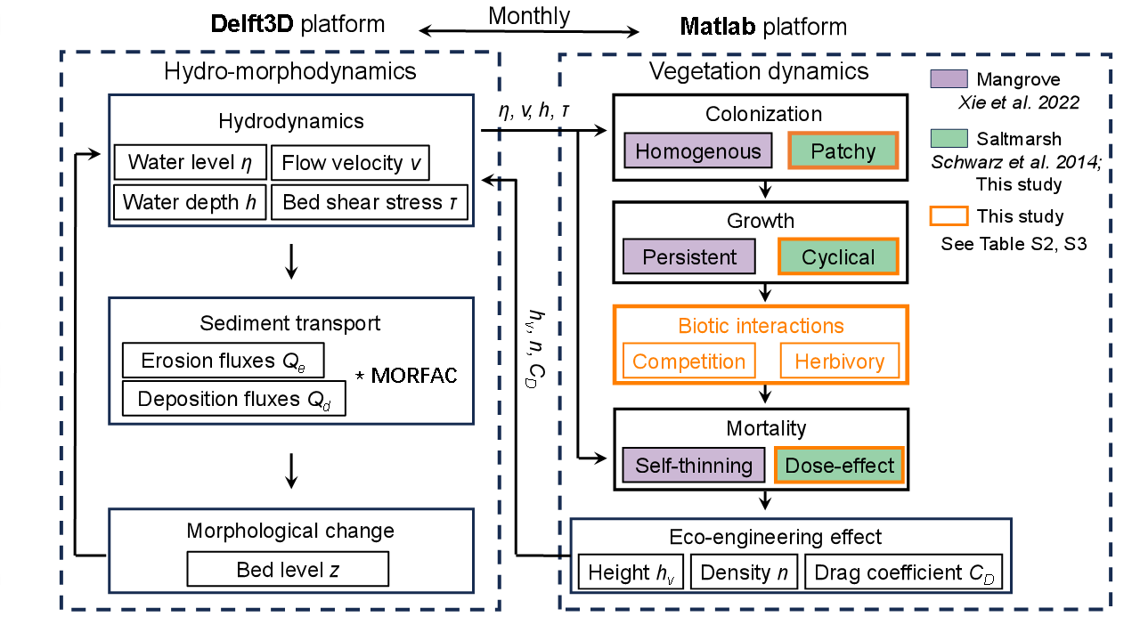 研究团队通过已有数据分析和数值模拟相结合的方式,深入剖析了我国典型红树林-盐沼交错区的演变及其地貌影响,团队首先改进了现有的河口海岸生物动力地貌模型,综合考虑了红树林和盐沼的动态演变、生物间的相互作用以及水沙-地貌的反馈机制(图1),开发出考虑红树林-盐沼两种植被竞争和共生的模块。以漳江口红树林-盐沼交错区为例,分别验证了在有无植被竞争条件下红树林的生长变化,结果与漳江口的实地观测数据高度吻合(图2)。基于此模型,模拟了多个交错区演变场景,发现:(1)植被的不同生长速率是影响植被竞争和共生关系的关键因素;(2)盐沼植被相较于红树林更有利于促进潮沟系统的大规模发展;(3)在盐沼潮滩中引入红树林时,红树林的扩张可抑制潮沟发育,而在红树林潮滩引入盐沼则可能促进潮沟发育,影响程度取决于盐沼的分布范围(图3)。本研究针对红树林-盐沼交错区生物动力地貌演变进行了建模研究,深化了对复杂生态交错区演变机制的理解,并指出滨海湿地演变模拟预测亟需更多观测数据,并且应充分考虑植被相互作用的影响,研究可为河口海岸湿地的生态保护与修复提供一定的科技支撑。本研究得到了国家自然科学基金委-联合国环境规划署(NSFC-UNEP)可持续发展国际合作科学计划重点项目的资助。