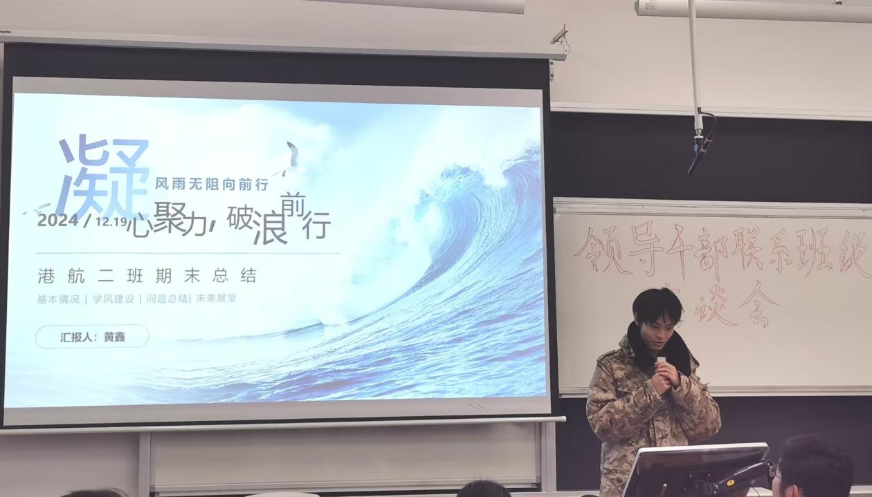 汇报结束后,同学们围绕“我心中的港航二班”为主题进行了分享,多角度展现了班级的特色与风采,使大家对这个集体有了更全面且深刻的认识。
