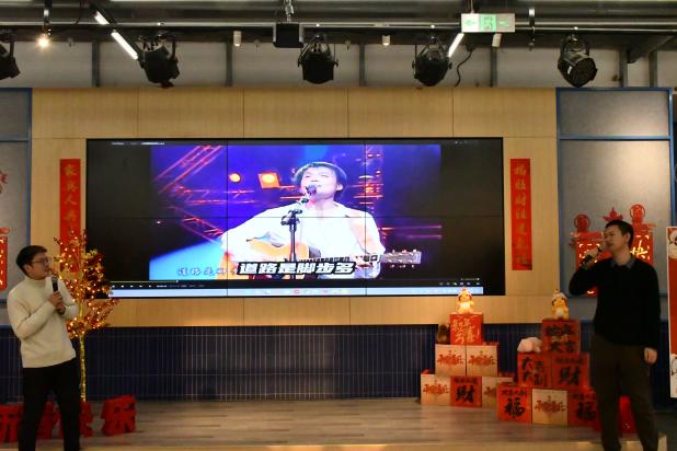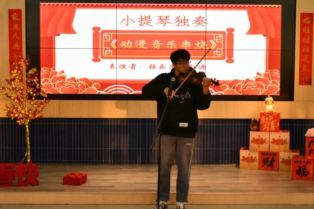 华灯璀璨映喜庆,妙曲悠扬迎新春!会场布置得温馨喜庆,彩带、气球、彩灯交相辉映,营造出浓厚的节日氛围。