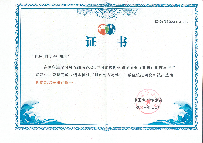 近日,在中国太平洋学会开展的国家级优秀海洋图书(期刊)推荐与推广活动中,由成人漫张荣副研究员、陈永平教授编写的专著《透水桩柱丁坝水动力特性——数值模拟研究》被评选为2024年度“国家级优秀海洋图书”。