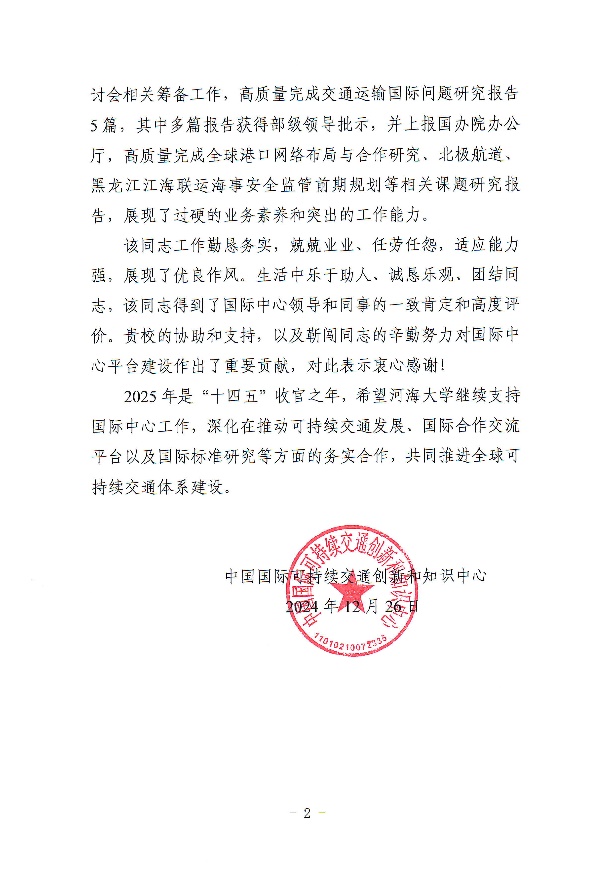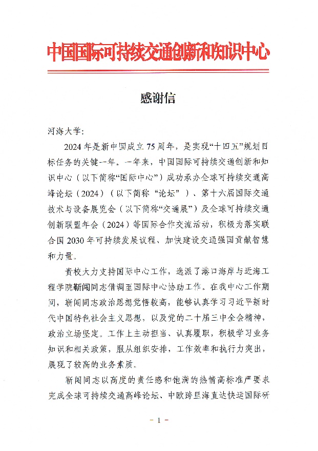 近日,国际中心向我校致信,对成人漫副研究员靳闯同志在借调期间的贡献给予了高度评价,同时向学校及成人漫 的鼎力支持表达了诚挚的谢意。信中指出,在国际中心工作期间,靳闯副研究员展现出了高度的敬业精神和扎实勤恳的工作作风,在交通国际问题研究及国际合作等方面展现了过硬的业务素质和突出的工作能力,相关研究报告获得了部级领导批示,为推动交通领域的国际合作与发展提供了有力的智力支持。