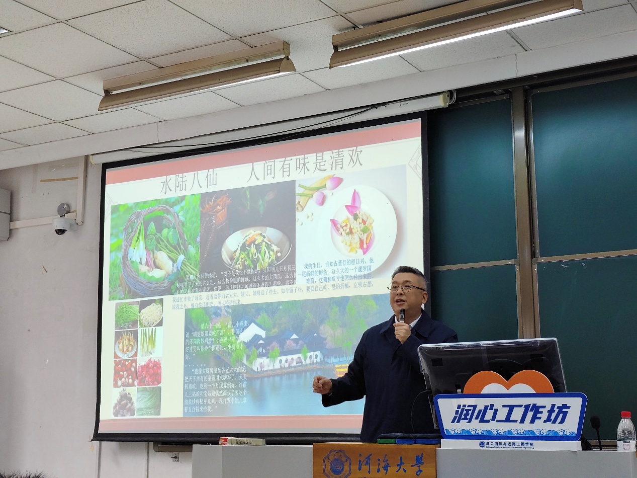 然后,黄欣老师引用《红楼梦》中的日常美食,帮助同学们了解了“水西门鸭”“水陆八仙”等南京美食文化,帮助来自全国五湖四海的同学们更加深入了解南京的日常生活。