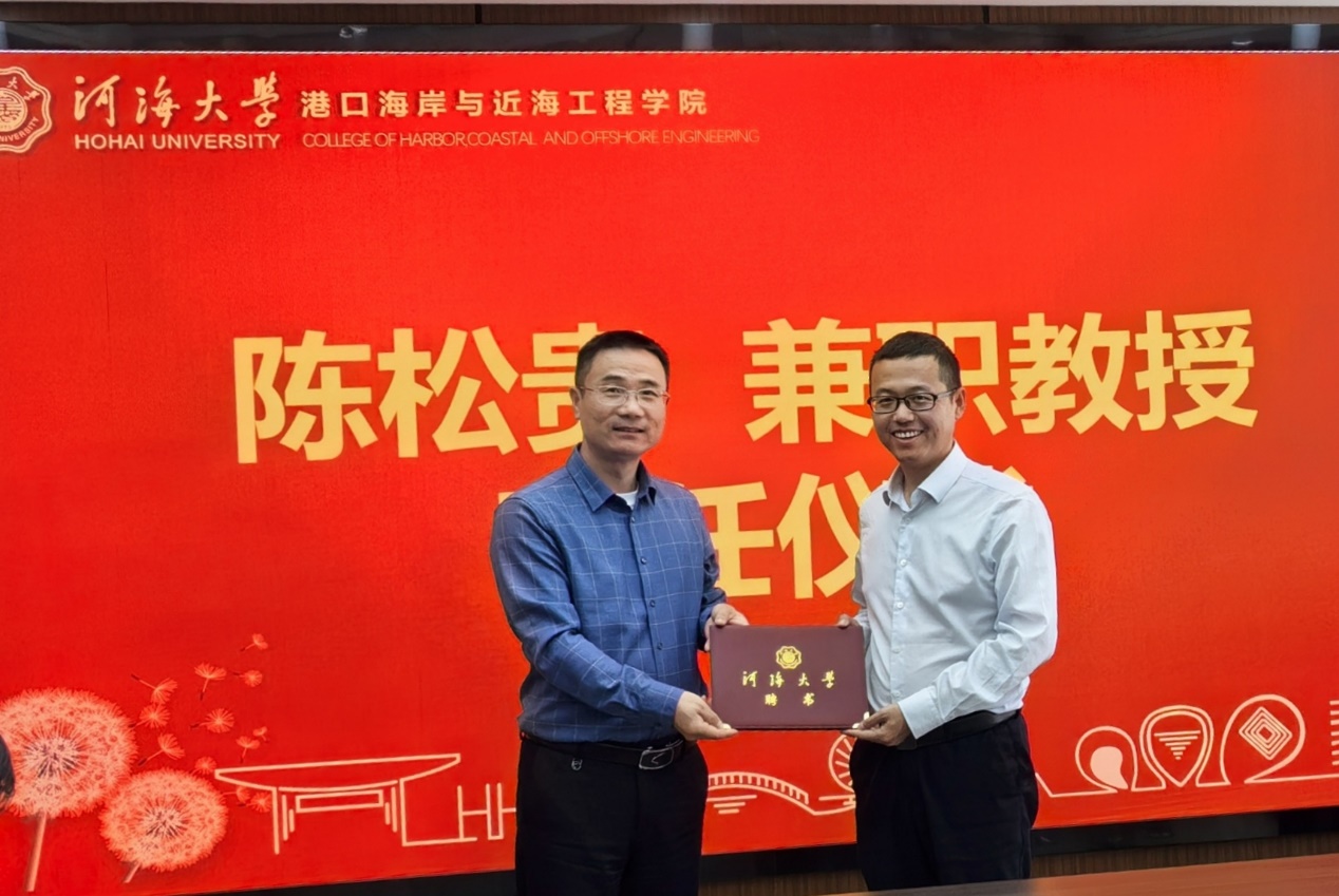 管大为副院长首先代表成人漫 对陈松贵研究员的加盟表示热烈欢迎,并详细介绍了陈松贵研究员的学术背景和科研成就。随后,龚政院长为陈松贵研究员颁发了兼职教授证书,并发表了讲话。龚政院长指出,陈松贵研究员的加入将进一步推动成人漫“船-岸-水”智能协同技术领域的发展,助力港口、海岸及近海工程学科和船舶与海洋工程学科的建设,同时为双方搭建更加紧密的合作交流平台。