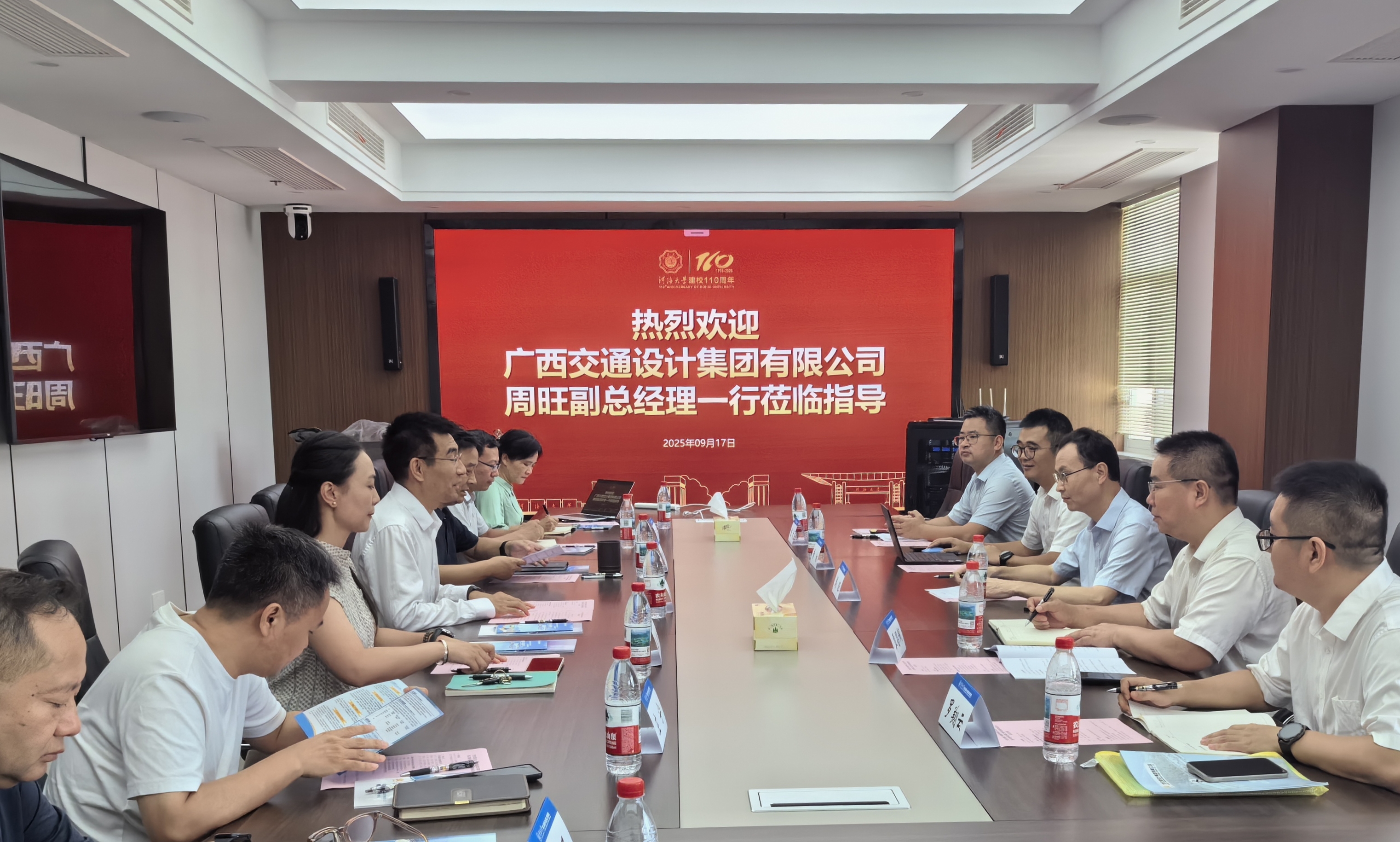 2025年9月17日上午,广西交通设计集团有限公司党委委员、副总经理周旺一行五人莅临成人漫 进行调研交流。成人漫 副校长宋翔洲及成人漫 领导、教授共同出席了座谈会。会议由成人漫 党委书记张雪刚主持。