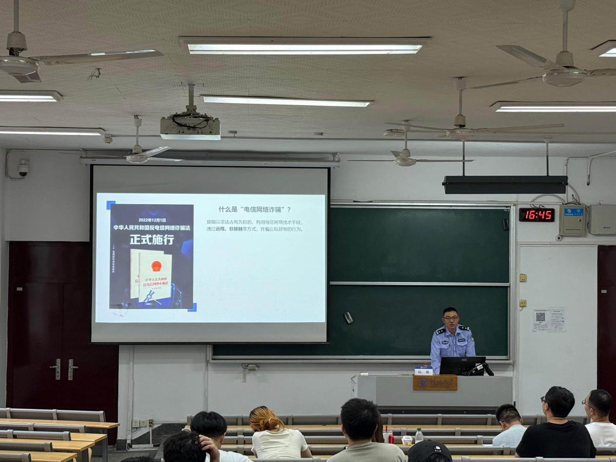 在反诈宣传环节,孙林警官介绍了校园常见诈骗类型。他详细讲解了网络钓鱼、虚假兼职、冒充客服等骗局的识别方法,并强调了保护个人信息的关键性,例如不轻易泄露身份证号、银行卡信息,以及及时向公安机关举报可疑行为。孙林警官还结合真实案例,演示了如何通过官方渠道核实信息,提醒新生保持警惕,培养安全防范意识。