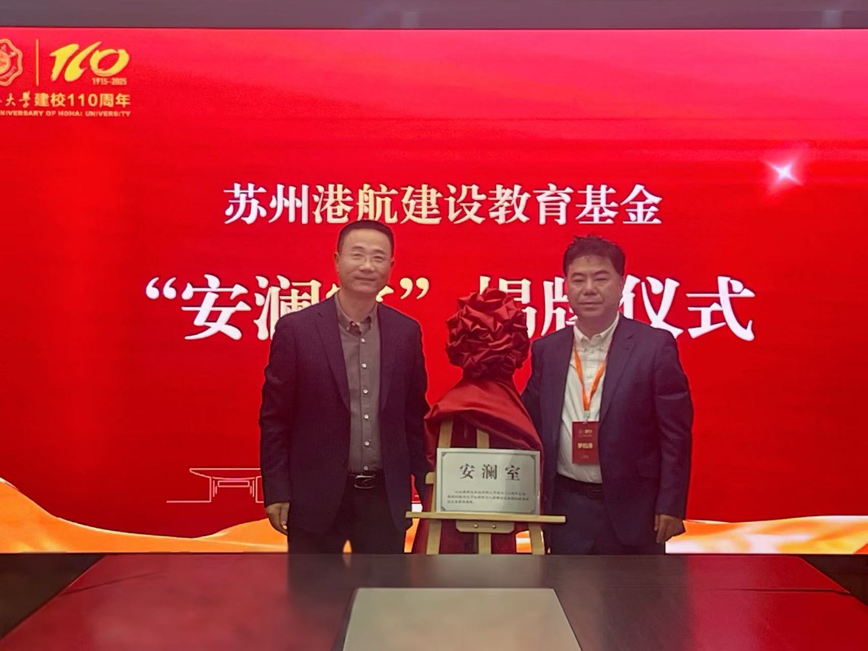 情系教育,润泽芳华。在我校喜迎110周年校庆之际,苏州港航建设工程有限公司慷慨捐资110万元人民币,设立“苏州港航建设教育基金”,用以激励成人漫莘莘学子奋发成才,支持成人漫 教育事业长远发展。为铭谢此善举,成人漫 特以公司名义及1996级港航校友冠名成人漫 502会议室,取意“江河安澜,人才蔚然”,定名为“安澜室”。