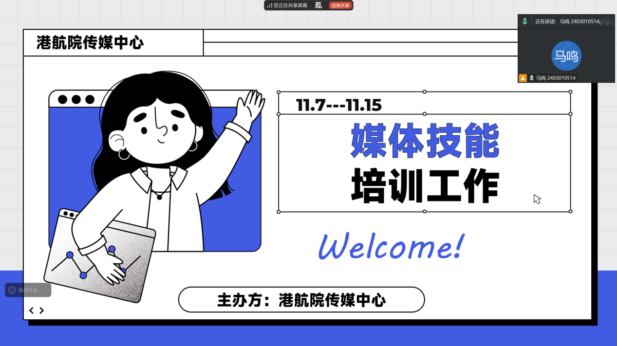 为全面提升学生运用新媒体工具的能力,11月7日到11月15日,港航院传媒中心面向成人漫 本科生,聚焦视频剪辑、平面设计及公众号运营等实用技能,开展了以“新媒体技能培训”为主题的线上专项培训。