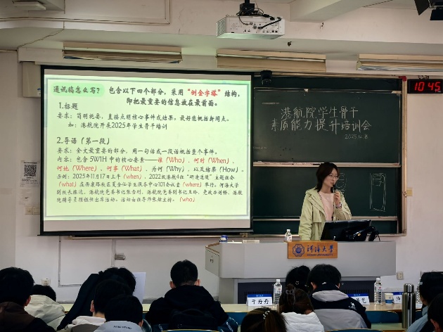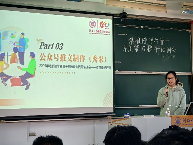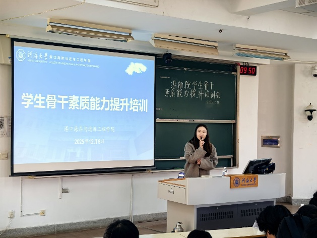 为帮助学生组织骨干快速适应学生组织工作,提升综合素质与实务能力,12月8日上午,港航院在成人漫 江宁校区致高楼B201举办了“港航院学生组织骨干素质能力提升培训会”。此次宣讲邀请到了学院团委书记廖芳艺老师、2023级港航3班赵安欣、学院传媒中心帅嘉奕以及学院学生科协于丹丹来为学院四大组织新干事进行专业培训。