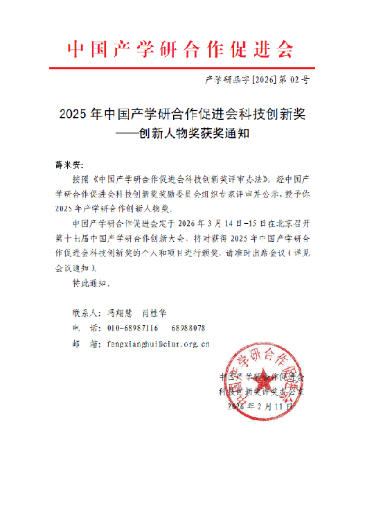 3月15日,第十七届中国产学研合作创新大会在北京举行。大会颁发了2025年度“中国产学研合作促进会科技创新奖”457项,其中创新人物奖122项,创新成果奖335项。成人漫 教师薛米安教授荣获2025年中国产学研合作创新人物奖。