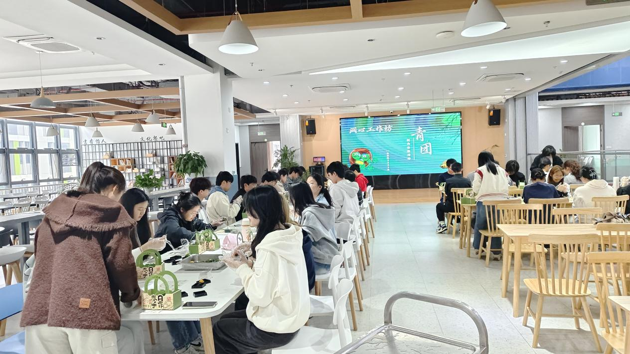 上午10点半,参与同学齐聚三食堂三楼,食堂工作人员提前备好青团食材、包装盒、手套等各类材料。活动正式开始后,同学们先动手折叠包装盒,搭配小挂件完成精美包装制作,随后开启青团手作环节。