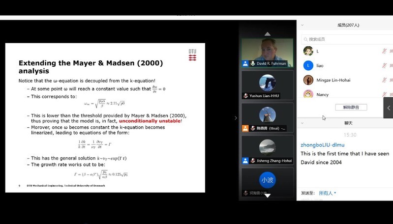 On July 23, 2020, the Key Laboratory of Ministry of Education of Coastal Disaster and Protection,organized the online academic exchange expert report meeting of Series Lectures on Protection and Utilization of Estuarine and Coast. Invited by Prof. Zheng jinhai, director of the Laboratory, Professor David R. Fuhrman of the technical university of Denmark, as the first report expert, gave an academic report entitled CFD of breaking waves and coastal dimensional transport using stabilized turbulence closure models. Vice dean Zhang Jisheng presided over the report meeting.