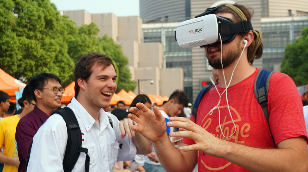 下午4点,游园会活动正式开始,此次学院的“VR”展台活动分为:扎气球、你画我猜、表情包大作战和“VR”展台四个部分。扎气球活动考验着参与者的专注度和维持平稳心态的能力,你画我猜与表情包大作战则充分考量着参与者之间的默契与信任,一系列趣味十足的心理小游戏吸引了许多同学前来参与,而高科技VR更是将本次游园会推向了高潮,同学们争相前来体验,甚至吸引了不少外国友人,让成人漫 的展台充满了欢声笑语,一跃成为人气最高的展台。